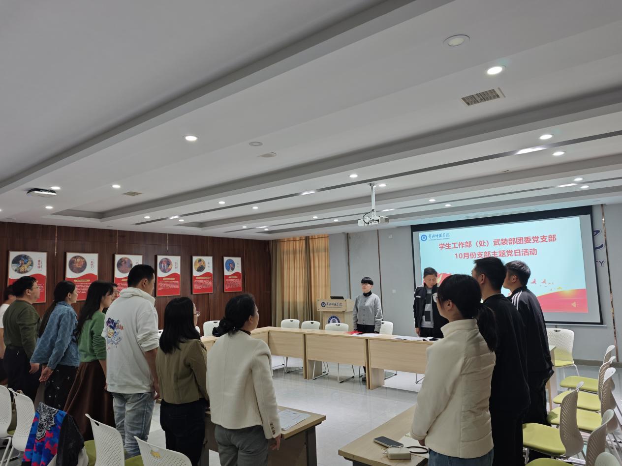 10月23日下午,学工部武装部团委党支部举行了主题为“欢庆华诞忆初心 锤炼作风担使命”的主题党日活动。活动在北区一站式学生活动中心青马班教室举行,胡周友同志主持会议并讲话。