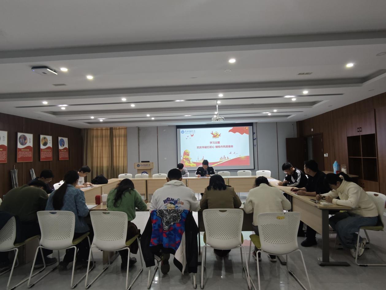 1023日下午,学工部武装部团委党支部举行了主题为“欢庆华诞忆初心 锤炼作风担使命”的主题党日活动。活动在北区一站式学生活动中心青马班教室举行,胡周友同志主持会议并讲话。